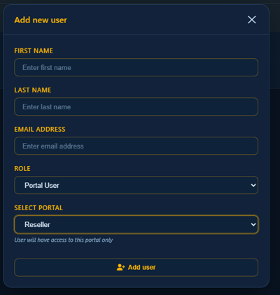 - Portal user: Assigning this role grants the user access to your partner portal. You must then select which partnership the user should have access to from a dropdown menu. If your account has multiple partnerships, you will be able to specify the appropriate one the user should be assigned to. Once the user is added, they will receive an email with login credentials, enabling them to access the partner portal with the permissions you have designated.