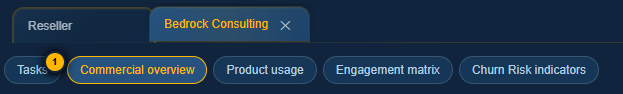For every company listed in the dashboard, you have access to in-depth customer information. This includes the list of assigned tasks for the account, a commercial overview with current order summaries, and multiple graphical insights such as product usage analytics, engagement matrices, and churn risk indicators. Note that the commercial overview submenu is available exclusively for reseller partnerships.