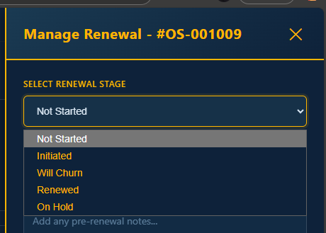 For each subscription, you are required to inform Holm Security of the renewal decision and specify the current renewal status. By selecting the Manage renewal button, a slide-out panel will appear on the right, allowing you to update the renewal stage—options include Not Started, Initiated, Will Churn, Renewed, or On Hold. Regardless of the renewal stage, your assigned Customer Success Manager will remain your primary point of contact throughout the renewal process and will receive the information you provide.
