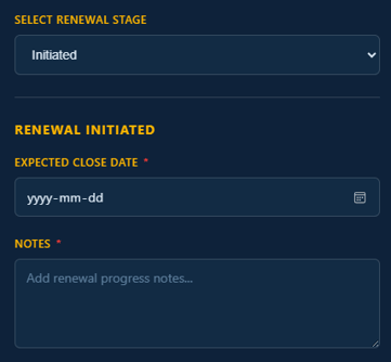In the Initiated stage, you are required to provide Holm Security with an expected close date for the renewal, along with explanatory notes detailing the rationale behind your selected close date.