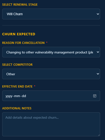 In the Will Churn stage, if the customer decides not to renew their subscription, you must select a specific reason for the cancellation and specify the effective end date—typically the end date of the current subscription period. If the effective end date differs from the standard subscription end date, please provide an explanatory note detailing the reason for this variance.