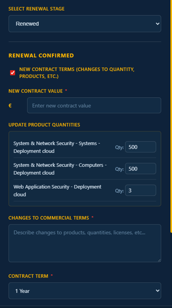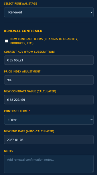In the Renewed stage, if the customer has chosen to renew their subscription, and the renewal is based on the same contract terms—including product names and quantities—you may leave the “New Contract Terms” field unchecked. The new Annual Contract Value (ACV) will be automatically calculated using the current ACV and the standard price index adjustment from the previous contract term. You will also need to select the contract term for the renewed subscription period and can add any relevant notes you wish to share with Holm Security.