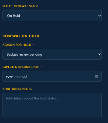 If you plan to renew a customer’s subscription but it is currently on hold, you can update its status to “On Hold” in the system. You will be prompted to provide a reason for the hold and indicate when you anticipate resuming renewal discussions with the customer.