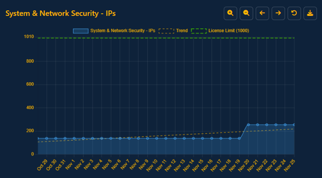 Within the product usage submenu, you can view graphical representations for all currently active products. For customers with a direct commercial agreement, the graphs also display current usage levels in relation to their licensed capacity, providing clear insight into license utilization. For guidance on navigating and adjusting any of the dashboard graphs, please refer to the general graph controls section at the end of this article.