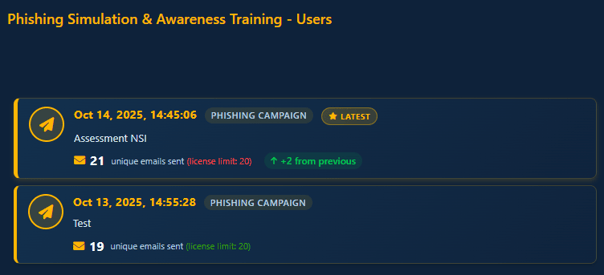 If your customer subscribes to the Phishing Simulation & Awareness Training product, instead of a graphical display, you will see a list of phishing campaign sendouts. This list provides key details for each campaign, including the campaign name, send date, recipient count, and additional relevant information.