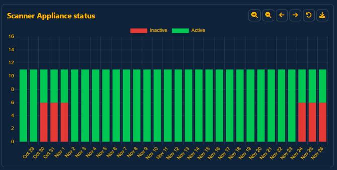 Within the churn risk indicators submenu, you can access a series of graphs that deliver actionable insights into potential churn factors, such as failed scans or instances where scanner appliances have gone offline.