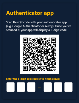 If this is your first time logging in, you will be prompted to set up Two-Factor Authentication (2FA). You will need to open your authenticator app, such as Google Authenticator, on your mobile device and scan the QR code presented on the webpage. Enter the 6-digit code generated by your app to verity the 2FA authentication.