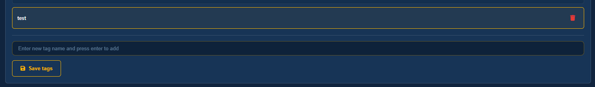 To add a new tag, enter the desired tag name in the input field below the current list of tags and press Enter. The tag will appear in the list. You can enter multiple tags in this way before clicking the Save tags button to confirm and store your changes.