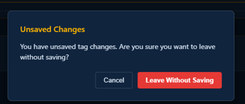 If you attempt to leave the Tags Manager before saving your changes, a prompt will notify you of unsaved changes. You can then choose to cancel and return to save your updates, or proceed without saving.