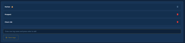 To delete tags from your list, click the red trashcan icon located to the right of each tag you wish to remove. Once you have made your selections, confirm your updated tag list by clicking the Save tags button. You can delete multiple tags at once, but changes will only be applied after you save.