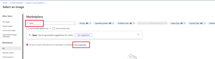- Search for Holm and click on View private plans to select the image that we shared with your environment earlier.